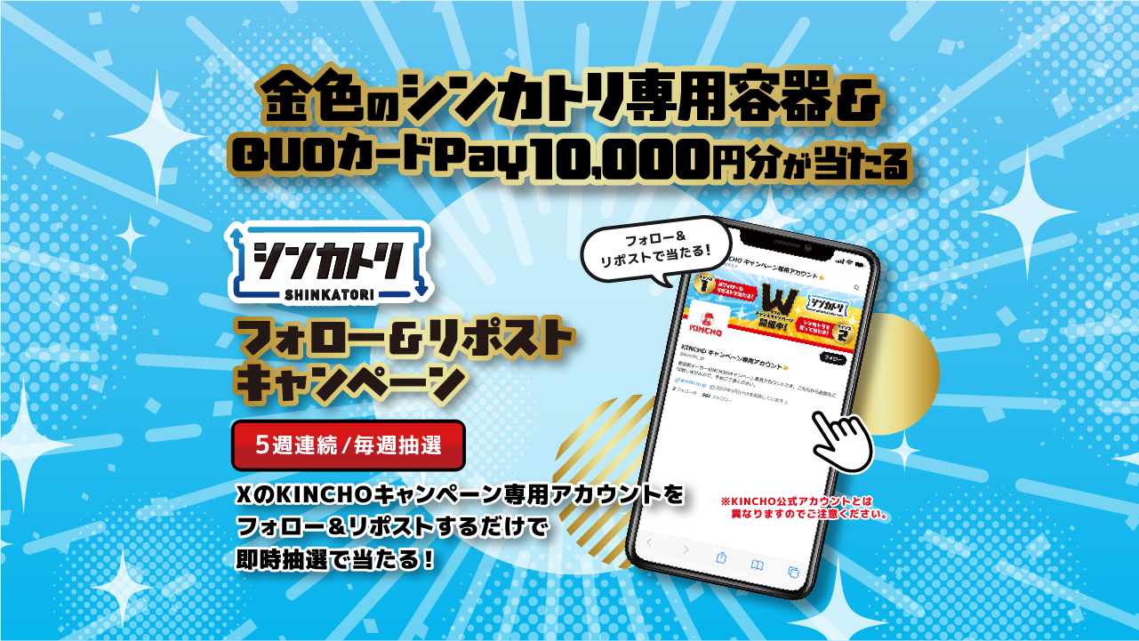 🚨総計5,050名様に当たる超特大企画【5週連続】🚨 毎週1,010名様に「QUOカードPay1万円分」や 「金色のシンカトリ専用容器」が当たる🎁✨ ▼応募方法 ① @kincho_pr をフォロー ② 対象の投稿をリポスト ③ 画像をタップして結果を確認!